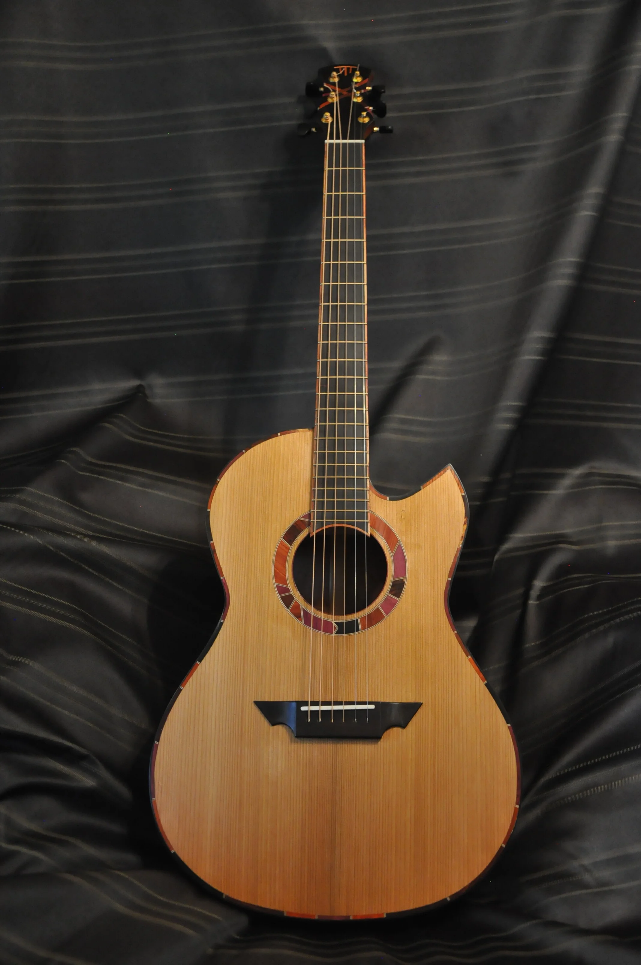This is a Hauser inspired design incorporating fan bracing (seven braces); 2 degree neck pitch. This particular guitar is Cocobolo Back/Sides with a Western Red Cedar Top - it has the depth and sonority one expects from cedar yet is extremely balanced across the dynamic range with articulated trebles and focused, present bass response.